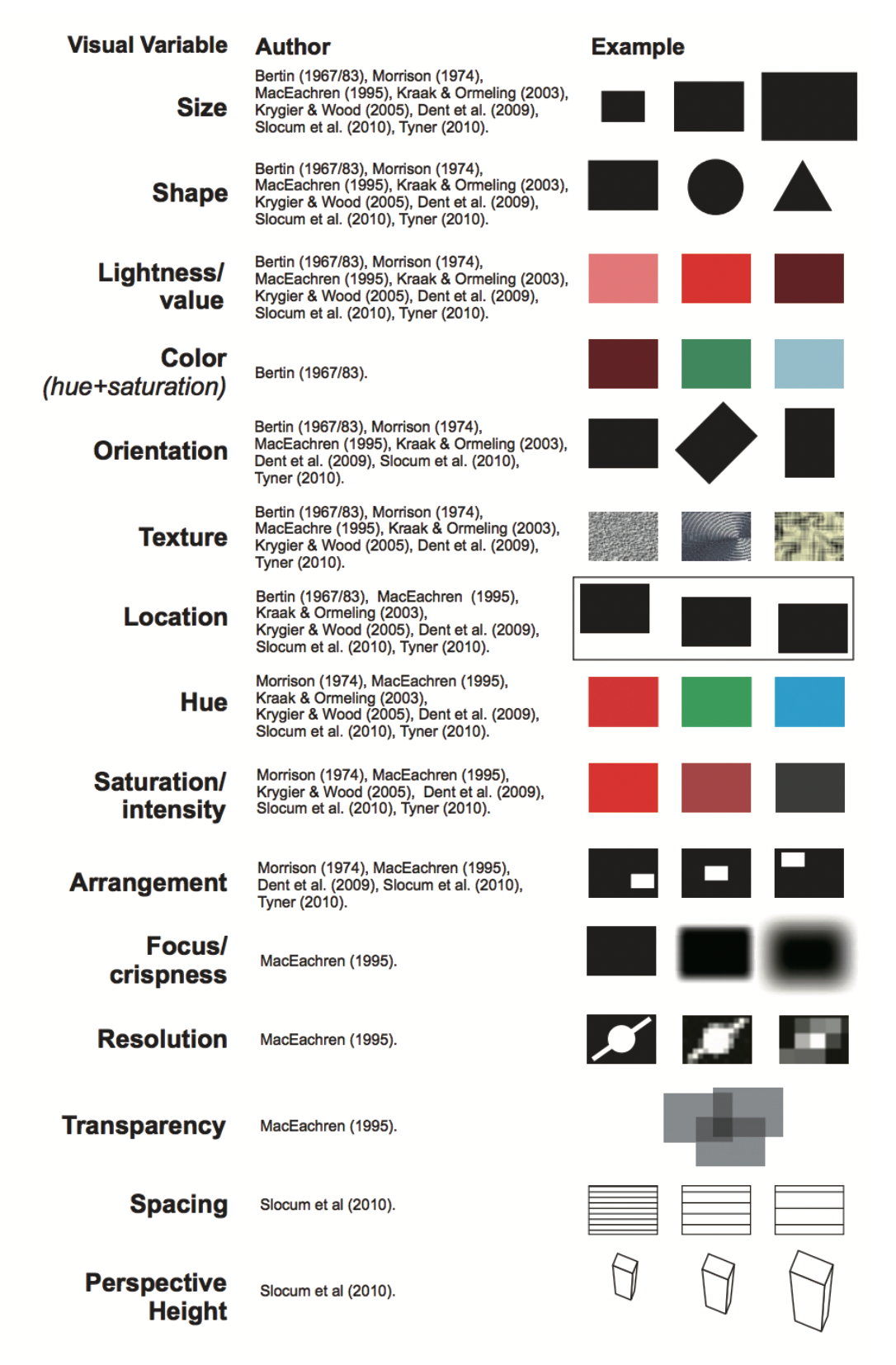 Bertin (1966) によってまとめられた視覚変数は次の通りです。