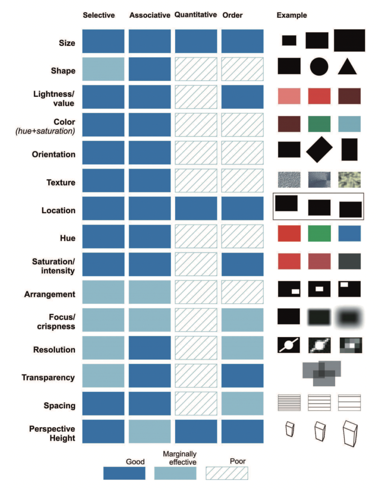 視覚変数の性質 人が理解・認知しやすい視覚変数の性質。連続的な値の差異を識別できるか、順序性を理解できるか、同種・異種のグループをすぐに把握できるかなど
