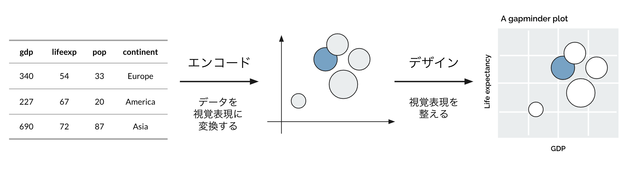 Wilkinson (2005) は、データセットへの可視化への変換について、以下のプロセスを提案しています。
